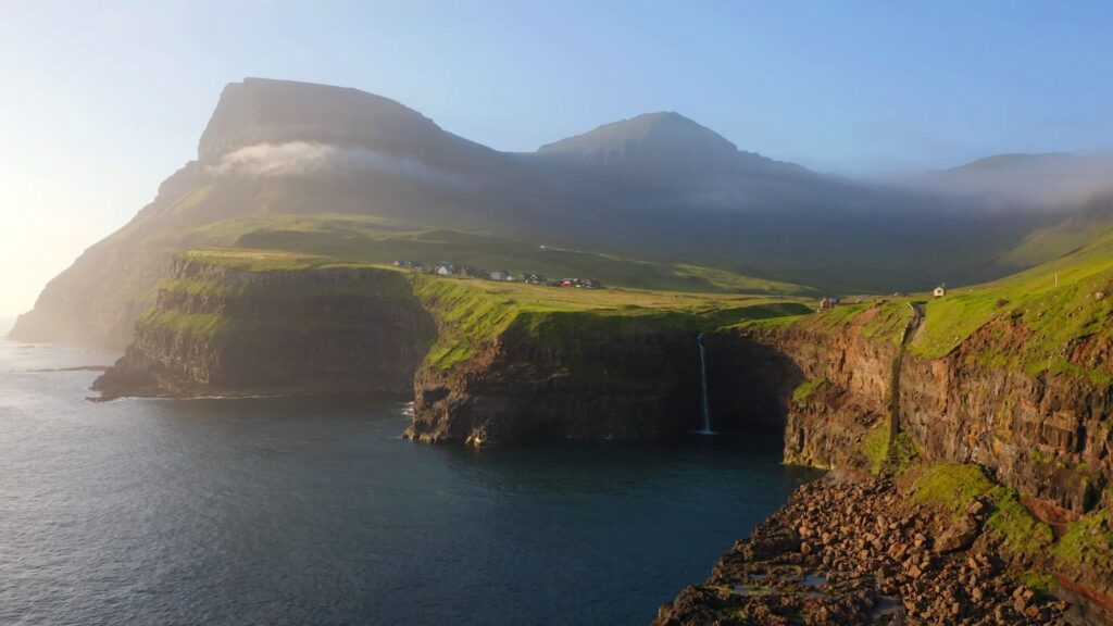 Gjógv, a picturesque village on Eysturoy’s rugged north coast, is celebrated for its unique natural harbour nestled within a sea-formed ravine. This ravine, the village’s namesake and lifeline until 1960, offers a glimpse into the harmonious blend of nature and Faroese tradition. The charming Guesthouse Gjáargarður invites visitors to dine in its cozy restaurant, enveloped by the village’s serene ambiance.